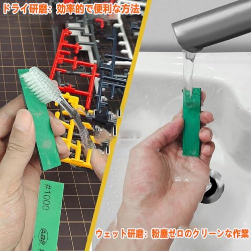 シンクや蛇口磨きは「600〜1000番前後」、プラモデルの白化消しは「1000番〜」が扱いやすいです。